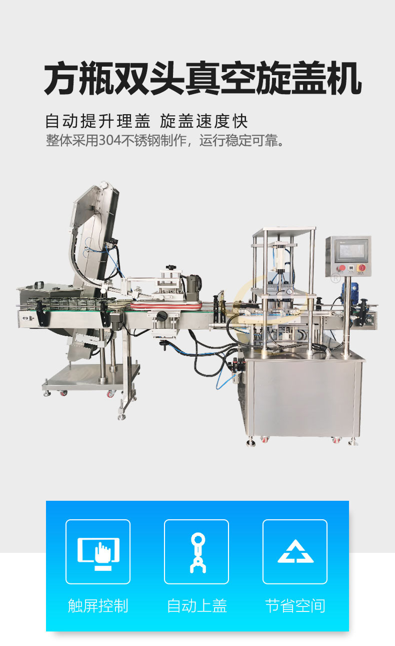 方瓶雙頭真空旋蓋機獨特的設計,可兼容多種不同形狀,尺寸的瓶子旋蓋,兼容性強,且調整方便;真空壓力可調,觸摸屏人機界面操作簡單方便。