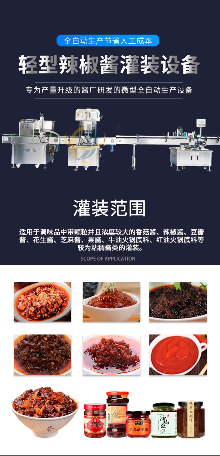輕型辣椒醬灌裝生產(chǎn)線適用于調(diào)味品中帶顆粒并且濃度較大的香菇醬、辣椒醬、豆瓣醬、花生醬、芝麻醬、果醬、牛油火鍋底料、紅油火鍋底料等較為粘稠醬類的灌裝。醬料灌裝生產(chǎn)線迅捷_02.jpg