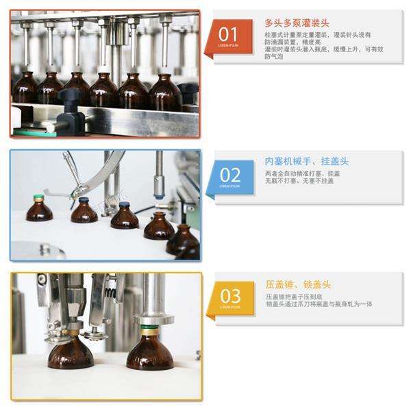 2. 穩(wěn)定精準快速:柱塞式計量泵定量灌裝,灌裝針頭設有防滴漏裝置,精度高。每分鐘可灌裝40-60瓶。