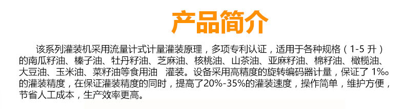 該系列灌裝機(jī)采用流量計(jì)式計(jì)量灌裝原理,多項(xiàng)認(rèn)證,適用于各種規(guī)格(1-5升)的南瓜籽油、榛子油、牡丹籽油、芝麻油、核桃油、山茶油、亞麻籽油、棉籽油、橄欖油、大豆油、玉米油、菜籽油等食用油灌裝。設(shè)備采用高精的旋轉(zhuǎn)編碼器計(jì)量,保證了1%o的灌裝精度,在保證灌裝精度的同時(shí),提高了20%-35%的灌裝速度,操作簡單,維護(hù)方便,節(jié)省人工成本,生產(chǎn)效率更高。
