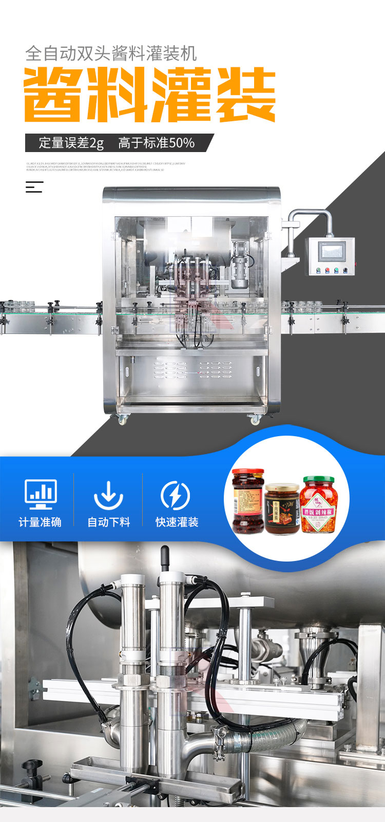 雙頭醬料灌裝機(jī)適用于調(diào)味品中帶顆粒并且濃度較大的香菇醬、豆瓣醬、花生醬、芝麻醬、果醬、牛油火鍋底料等醬類的灌裝。