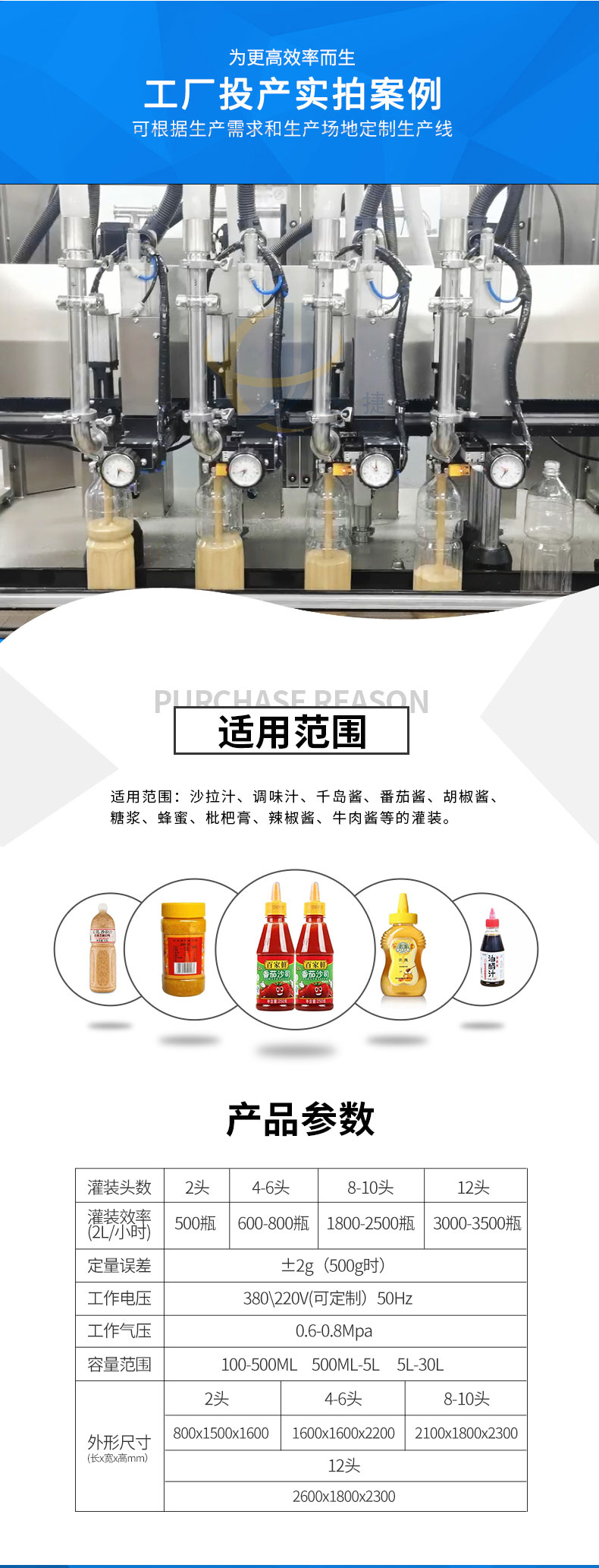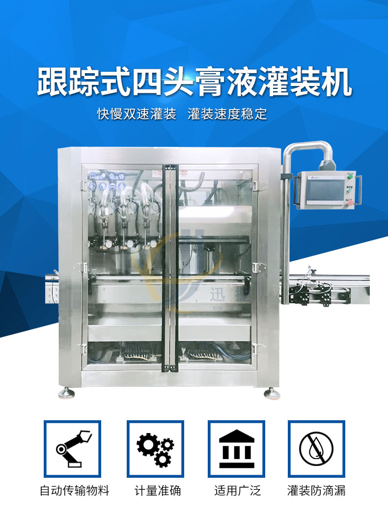 追蹤式膏液灌裝機適用范圍:沙拉汁、調(diào)味汁、千島醬、番茄醬、胡椒醬、糖漿、蜂蜜、枇杷膏、辣椒醬、牛肉醬等的灌裝。