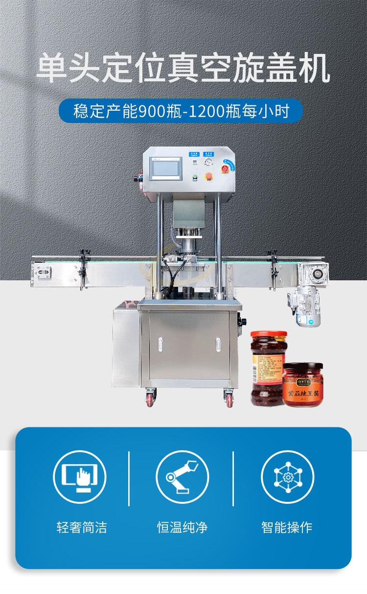 單頭定位真空旋蓋機(jī)適用多種瓶型。通過(guò)更換模具,即可適合于不同形狀、尺寸瓶子的真空旋蓋,換產(chǎn)方便。